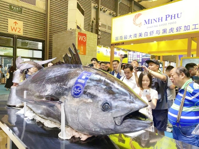 来自西班牙的720斤蓝鳍金枪鱼切鱼秀现场,被围得里三层外三层;新疆吐鲁番除了葡萄,也养三文鱼了;还有来自东南亚的身长20厘米的黑虎虾、俄罗斯帝王蟹、厄瓜多尔白虾、挪威三文鱼、智利雪蟹……昨天,第19届上海国际渔业博览会在新国际博览中心“开市”,全球各种水产汇聚,可谓“一网打尽”世界的鲜味。原本,这个展会只对专业观众开放,可吃货阿姨爷叔们总能弄到入场券,前来品尝全球美味。