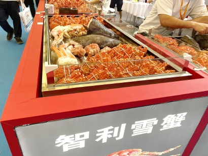 在一家经销智利雪蟹的展台,负责人已经被问了好几次卖不卖,他表示,“星期五,也就是展会最后一天,展品向参观者零售,省的打包带回去了。”据了解,这个展台的雪蟹一公斤82.5元,小一点的一只在400克左右,大约40元。