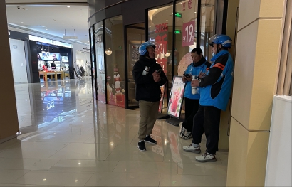 下午2到3点,马当路一带的外卖小哥都很忙,他们拿着一单单饮料,一个接一个从商场走出。在这个时间段内,我们很少看到停下休息的骑手。