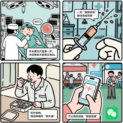 针对这个靶点,团队创新性提出“术中持续静脉输注利多卡因”的方案——这种临床常用的局部麻醉药,能有效抑制NETs产生。“就像给过度活跃的免疫反应‘踩刹车’,改善危重脓毒症患者免疫稳态,促进患者术后康复。”缪长虹解释道。