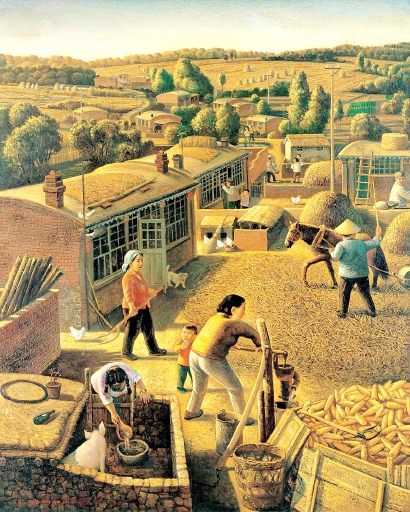 而辽宁画家陈树中的作品《野草滩的农忙时节》,则宛如一首热烈的“橙黄”诗篇。陈树中始终钟情于北方农民题材的油画创作,在这幅画中,他以独特的艺术视角,生动地描绘出农忙时节野草滩的热闹景象,让人仿佛能感受到那扑面而来的丰收气息。