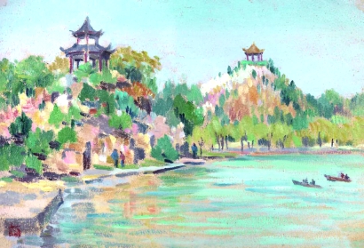 在展厅之中,陈列着一幅出自中国油画先驱者之一周碧初之手的佳作——《秋波双亭》。这幅画作诞生于20世纪60年代,它以细腻笔触勾勒出秋日水岸边亭台的秀丽景致,画面中洋溢着印象派那标志性的明快色调,笔触亦是轻盈灵动,令人观之顿感心旷神怡。