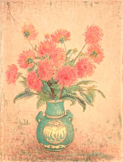 此次展览中,潘玉良创作于20世纪50年代晚期的《青瓶红菊》得以展出。潘玉良是20世纪早期在中西画风融合方面具有开创性贡献的艺术先驱,同时也是中国留法艺术家群体中的杰出代表人物。她在艺术创作领域展现出卓越的才华与广泛的涉猎,于油画、水墨画、素描、版画、色粉画、雕塑等多个艺术门类均取得了显著成就。