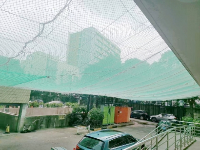 1号楼的门前是小区的主要通道,防护网占了一小半空间。2号楼的防护网就拉得比较“到位”,从大楼的这一侧一直拉到对面的地面车库,严严实实。抬头望天,全是网眼。