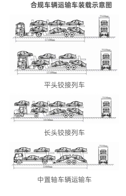 根据《方案》,按照有关要求,平头铰接列车装载超过6辆、长头铰接列车装载超过7辆、中置轴车辆运输车装载超过9辆的车辆运输车,均被认定为违法运输车辆,禁止驶入高速公路。