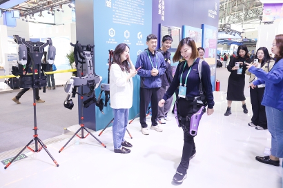 当日,博物馆公教品牌“来问大师”特约藏品捐赠代表、上海傲鲨智能科技有限公司创始人徐振华,在展台开展互动,带领观众体验V IATRIX外骨骼机器人的穿戴使用——该套装置是电影《流浪地球2》中亮相的“原版设备”的升级版,活动现场人气火爆。这一充满科技感的体验环节,也展现了上海在“智能硬件+A I”融合创新方面的技术优势。