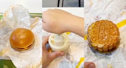 最近,有“脑洞大开”的网友将一个圆滚滚的小汉堡塞入月饼模具,压出了一个和传统月饼外形几乎一模一样的“汉堡月饼”:与广式月饼相似的棕黄色的表面上是熟悉无比的花纹,中间还有“中秋”两字,如果不看边缘溢出来的牛肉和酱料,那俨然就是一个老式“月饼”。