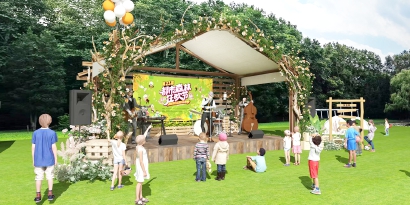 今年的“森聆剧场”主舞台位于天鹅池大草坪,舞台设计走露营风格,迎合当下年轻人的审美。