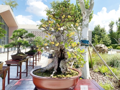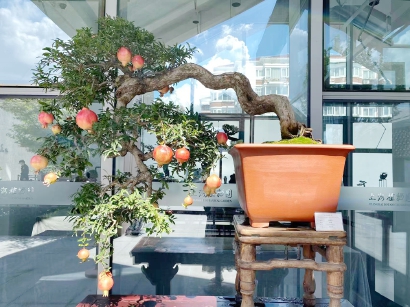 近60件作品涵盖树木盆景、小微盆景和奇石珍品,在上海植物园四号门的室内和室外空间展出。记者看到,树木盆景包括石榴、黄杨、柿子、海棠、松柏等,呈现一场融合艺术性、科学性、观赏性的视觉与文化盛宴。