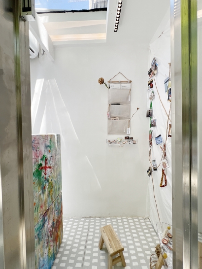 记者第一次来到“一又二分之一空间”差点就走过了头,因为在小区门口的它因为太小,实在是不够瞩目。门口贴着二维码,贴心告知扫码后将链接复制到手机浏览器就可以“芝麻开门”。当时这里正在举办一个“套娃展”,有两位艺术家在此呈现了作品,后续还会有更多。令人意外的是,如此小的空间里,还有一台冷气十足的空调,天窗的设计让这里有着自然光带来的通透感,一个人在里面也不会局促,“我们曾经想看看这里到底可以容纳几个人,最后塞进去了6个人,哈哈哈”,Luyi笑着说。