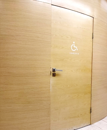 记者注意到,跟着导向标识往女厕所方向走时,必然会经过张女士所述的人行通道。通道本身并不算特别狭窄,但两侧均有功能区。一侧为休息区,另一侧则设计为弧形,弧形墙壁上有同材质、同色的门,标有“清洁间”“无障碍厕所”标识,门上有突起的把手和门锁,门外侧未见相关“当心开门”的提示标语。