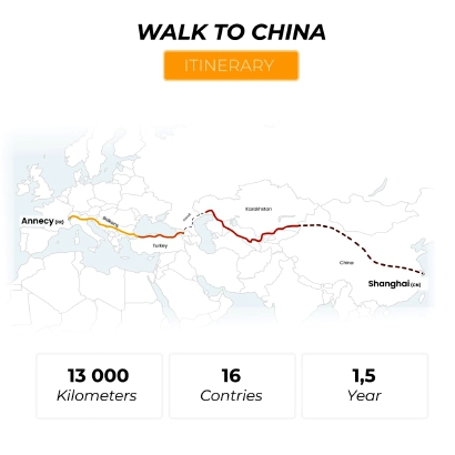 2024年9月,他们踏上了前往中国的旅程。和此前已经来过中国,此后还将来中国的数以千万计的旅行者不同,他们从最初就摒弃了飞机这一交通工具。因为两人都十分关注环境问题,其中一人当时的工作就是评估碳足迹。他们最终决定步行去中国,从两人的老家安纳西出发,目的地上海。全程预计13000公里左右,途经15国——中国是第16个。