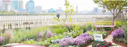 杭州的花境设计以长三角的水脉为灵感,以“水蕴明珠”为设计概念,将“水滴”之形转译为涟漪状的植物形态,最终凝聚为“明珠”之象——既是对隔岸东方明珠塔的致敬,也是对自然与文化在北外滩汇聚,收获丰实的礼赞。花境里,有“西子烟雨”“西子伊人”“西子春和”等多种杭州培育的月季,也有马利筋、樱桃鼠尾草、火炬花等花草,希望它们可以在北外滩形成自我更新、持续繁茂的稳定群落。