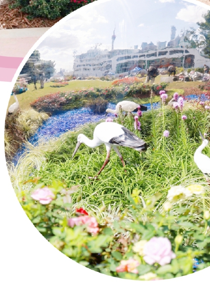 合肥的花境从安徽巢湖出发,以“巢湖轮廓+东方白鹳”为生态元素,巢湖之水跨越千里,与黄浦江波光相融,寓意长江流域文明的同源共流。花境里,球菊、乒乓菊、欧月、狐尾天门冬等花草绽放。