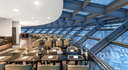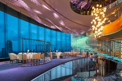 亮点:蓝天旋转餐厅位于上海新锦江大酒店41层,7米落地玻璃窗、360°俯瞰上海街区、近万根捷克手工玻璃“水晶棒”、国内唯一的“独梁”结构旋转楼梯、白玉兰元素写意挥洒、意大利手工定制家具……“蓝天旋转餐厅”以惊艳设计感备受海内外食客以及时尚潮人的关注,被媒体称为坐落于上海41楼上空的“空中水晶宫”。