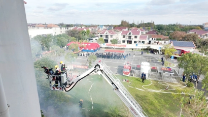 消防救援人员到场后,利用云梯车、拉梯成功营救阳台及高层被困人员。随后,搜救组深入火场,使用救援转运椅、担架救出被困老人,攻坚组利用消防水炮、大功率水罐车实施灭火,演练取得圆满成功。