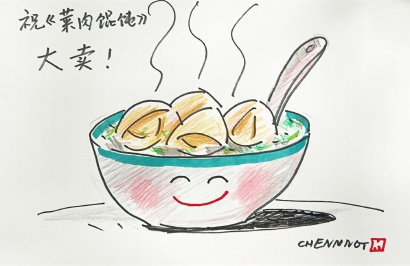 在晨报录制节目时,陈明兴致勃勃当场画了一张馄饨漫画,寄语电影票房大卖。“我希望更多市民走进电影院观看《菜肉馄饨》。这部电影并不是要年轻人一定要去按照家长意愿结婚生子。时代在变,年轻人有他们的想法,我们要尊重年轻人的选择,这一点是很重要的。”陈明说。