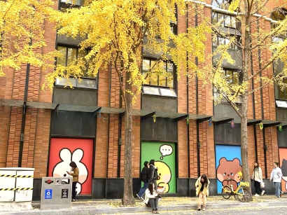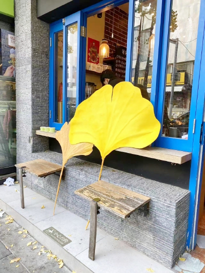 高大、树叶浓密的几株银杏树是打卡热门。花间蜜语花艺店门口,快门声此起彼伏。蓝屋咖啡的户外座椅区被落叶环绕,店家还自制了2片超大“银杏叶”,市民手持咖啡与金黄背景同框,构成治愈系画面。星巴克门口也是打卡热点,品牌标识与银杏同框是经典的拍法。8号桥园区门口,金黄的银杏叶与红色建筑墙体形成强烈色彩对比,成为摄影爱好者的必拍点位。今年,还有人给路口的三棵银杏树穿上了毛衣。