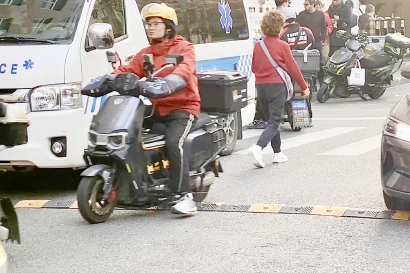 记者看到,每当成都北路上的绿灯亮起,车辆从西往东而来,确实会在凤阳路这一段形成短时拥堵。无论是机动车还是非机动车,都会放慢速度。有的快递小哥跑得急,电瓶车在减速带上驶过时,就会跳荡一下。