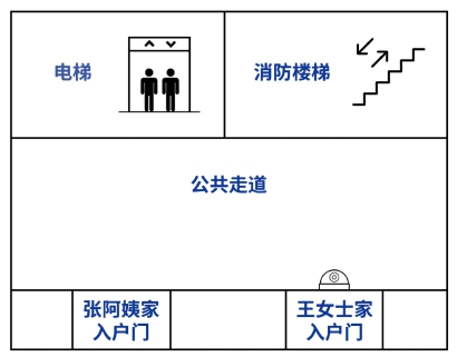 张阿姨与王女士为隔壁邻居,两家大门相邻,共同朝向一条公共走道,走道一侧为消防楼梯,另一侧为电梯出入口。小区物业已在电梯及单元门入口处安装了公共监控。