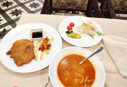 每位客人的面前,一套由勺、叉、刀组成的不锈钢餐具三件套,一份折叠的餐巾,桌上还有一小份假花……足以唤醒上海人昔年的西餐记忆。等到上了菜,那盘子也老式得让人眼熟万分,就像从大脑的回忆深处掏出来似的。