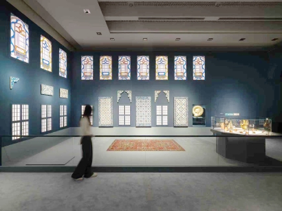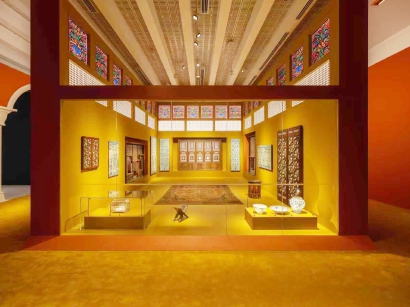 塞西尔·德戈将观众置于印度、伊朗与奥斯曼世界的核心,摒弃了可能喧宾夺主的装饰堆砌,转而营造出沉浸式的各个场域。浦东美术馆宏大的展厅空间为玉石、陶瓷、手稿等珍贵精微的展品构建一个更亲密且富有韵律感的展示尺度变得至关重要。独家定制的展陈设计以“建筑中的建筑”序列展开:色彩、形态与空间节奏经精心编排,既引导视线又重塑感知,同时避免了落入历史仿写的窠臼。三个板块分别在与极具特色的建筑、材料和光影相呼应的色彩情境中渐次展开,既让观众沉浸于每种文化的独特氛围,又揭示出图案和其影响在彼此之间的流转轨迹。特别展出的两间复原陈列室以近乎原貌的方式,再现了奥斯曼帝国的宫廷及富裕民居一隅,为观众提供身临其境的观展体验。