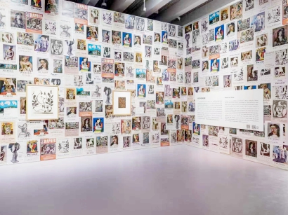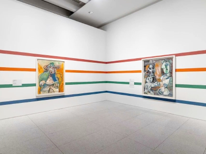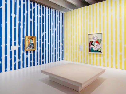 保罗·史密斯让展墙本身成为跨界对话的载体:在“古典主义画家”主题空间中,素描作品密集悬挂,灵感来自巴黎沙龙的经典陈列,同时呼应保罗店铺中的“艺术墙”理念,实现传统与现代的平行对话;在“条纹”主题空间,毕加索作品中的线条与保罗标志性的彩色条纹叠加,形成图案与图案的互动;部分展厅则借鉴巴黎街头的“城市牛皮癣”手法,贴满毕加索历史展览海报,以直白的重复制造视觉冲击。这些设计不仅融合了两位艺术家的视觉元素,更让观展体验本身成为一场沉浸式、充满节奏与情感的视觉旅程。“希望打造一种更强调视觉感受与直觉接受的观展方式,使年轻观众与初识毕加索的公众都能在色彩、乐观精神与横向思维中获得启发。”史密斯说。
