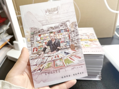 旧门店纪念明信片的图片选用了建筑师老任的绘画作品,建筑师老任今年10月底去吴淞路的报刊门市部,为姜师傅画了人物速写并上了水彩颜色。老任告诉记者,他准备明年元旦过后把原画装框送给姜师傅,作为报刊门市部的乔迁之礼。
