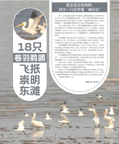 眼下,崇明东滩无垠的芦苇荡里,正栖息着数以万计的各种鸟类,其中,18只卷羽鹈鹕弥足珍贵。近日,崇明东滩国家级鸟类自然保护区监测人员记录到18只国家一级保护野生动物、全球近危物种——卷羽鹈鹕,数量仅次于去年冬季最高峰的22只。