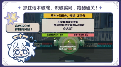 关卡中随处可见的细节设计,更是藏着云端的巧思。点击不明链接后,Q版像素“派蒙”会及时出现提醒“不明链接不要点”;反诈问答环节,特意设计了“投入原石,三天返十倍”这类贴近原神玩家的问题,让反诈知识更具针对性;玩家身份分为“暴富脑冒险者”和“反诈搭子”两种,前者容易被“诱惑糖果”吸引,答对问题可获双倍积分,后者能勘破诱惑解救同伴,解救后还会弹出反诈标语;关卡内的“诈骗机关”也暗藏玄机,答题错误可能导致机关消失损失积分,或直接被困需同伴救援,还有“虚假平台”“虚假提现按钮”等障碍,需玩家默契配合才能通关。