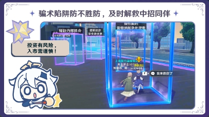 在场景与剧情设计上,云端充分融入《原神》元素,打造了沉浸式的反诈情境:归家的旅行者途中收到“千星奇域官方”发来的短信,声称“动动手指就能日入过万”,即便小“派蒙”及时提醒,心动的旅行者仍点击链接,两人随后被拉入“财富导师”构建的虚拟现代化城市,唯有打败这个诈骗头目才能顺利通关。“用玩家熟悉的角色和世界观做载体,能减少距离感,让大家更容易接受反诈内容。”云端解释道。