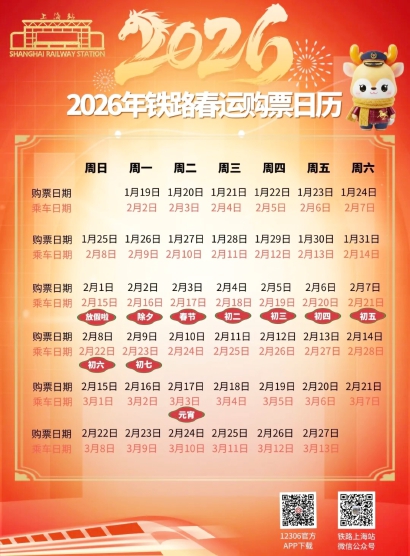 铁路部门介绍,2026年铁路春运自2月2日开始,至3月13日结束,为期40天。全国铁路预计发送旅客5.39亿人次、同比增长5.0%,节前客流高峰日预计为2月13日(腊月廿六),节后客流高峰日预计为2月23日(正月初七)。春运首日火车票将于1月19日开始发售。