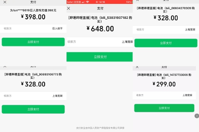 记者体验的5个网站中,有4个网站最终跳转的付款界面,收款方显示的是“上海宽娱”,商品为哔哩哔哩直播电池,商品后面带有不同的B站账号;1个显示的收款方是“巨人统平”,显示是为巨人网络的一个游戏账号充值。