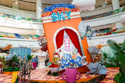 在商场各处还设有“SKY艺术生活节”的美陈装置,把疯帽子的茶话会、魔法浴室、巨型花海、兔子洞隧道、奇幻画廊等场景都搬进了现实,带大家进入满是奇趣脑洞的异想世界。