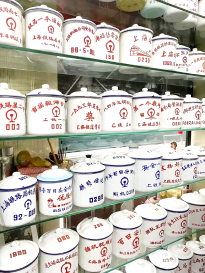 “这张1956年的铁路先进生产者集体大合影,这枚淞沪抗战的银章,还有这面玻璃钢制的流动红旗……这些铁路藏品在全国都很稀有,有的可能独一无二。”在岚灵花鸟市场40多平方米的工作室,中国铁路上海局集团有限公司退休老司机刘四平向记者介绍着他的宝贝藏品:不同年代、不同铁路局的帽徽、路徽、火车票、站台票、行李寄存票、茶水票、搪瓷缸子……各种藏品多到令人眼花缭乱。小小的工作室也成了铁路收藏界的“打卡地”,甚至美国、英国、意大利、智利等国的老外铁路收藏迷都慕名而来。