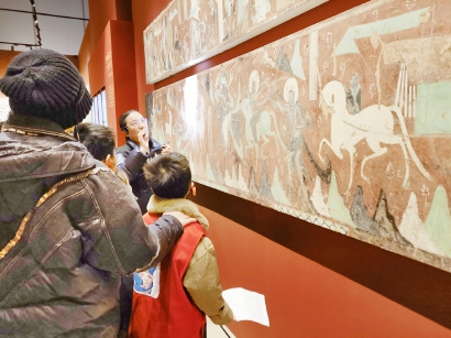 而第249窟的《狩猎图》复刻品,则让小记者们感受到了不一样的敦煌气息。顺着讲解老师手中的灯光,扬蹄的牛、嘶叫的马、奔跑的鹿、威武的虎清晰可见,更有趣的是,画面中还有猪妈妈带着小猪一家悠闲散步的场景,动静结合,充满生活气息,让大家感受到了古代先民的生活意趣。