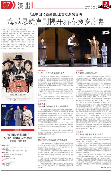2026年2月7日晚,改编自美国“硬汉派”侦探小说开创者达希尔·哈米特经典小说《马耳他之鹰》的“南腔北调贺岁话剧”《圆明园马首谜案》在上海上音歌剧院迎来首演。这部由上海黄浦文化旅游集团有限公司、上海对外文化交流有限公司、上海吉贰临文化传播有限公司、上海文化发展基金会荣氏文化专项基金、荣氏文化基金会、上海兴越拾光文化传播有限公司等上海多家文化机构联合主办,上海吉贰临文化传播有限公司制作出品的贺岁大戏,将美国冷峻侦探叙事巧妙移植至老上海语境,以“马首”文物为线索,编织出一张谎言、欲望与正义交织的悬疑之网。