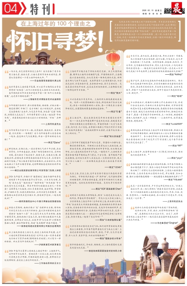 “上海外滩万国建筑春节的灯光秀、豫园的八仙桥灯会,都是很有特色的,外滩的江边美景也让人流连忘返,还有南京东路、淮海西路商场里的年货市集,处处都充满年味,让人感受到浓厚的节日气氛。一般情况下,上海的很多商店和超市春节期间也开门营业,十分方便。春节期间严禁乱放鞭炮,这对我们老年人来说也是一大特别的利好,晚上可以安心入睡了……这些都是我喜欢在上海过春节的理由。”
