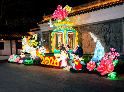 暮色降临后,非遗展演与民俗狂欢成为主角,逸野堂平台的丝竹快闪婉转悠扬,南门香樟林下的皮影戏演绎经典民俗故事,大草坪的舞龙舞狮气势如虹,锣鼓声中点燃节日热情。贯穿老园区的华灯巡游更是亮点,流光溢彩的灯组与亭台水榭、古树名木交相辉映,跟随巡游队伍漫步,随手就能拍出国风大片,在500年古园的雅韵与烟火中,感受最地道的元宵氛围。