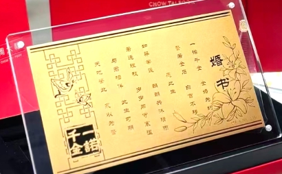 最近,周大福一款0.05克的黄金婚书在网上卖疯了。虽然只有0.05克,但这张黄金婚书长23.4厘米、宽13.14厘米,被买家称赞“好大一张”。