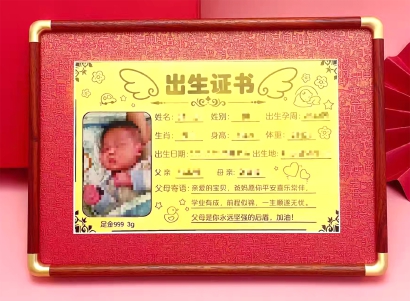 去年起,三岁以内婴幼儿家庭可领取3600元育儿补贴。当别的父母还在热议这笔钱是存是花时,有些家长已经把它变成了足金小金片,上面印着宝宝的昵称,写明是育儿补贴再加上一个爱心表情符号,收纳在专属礼盒中,作为宝宝的成长纪念。