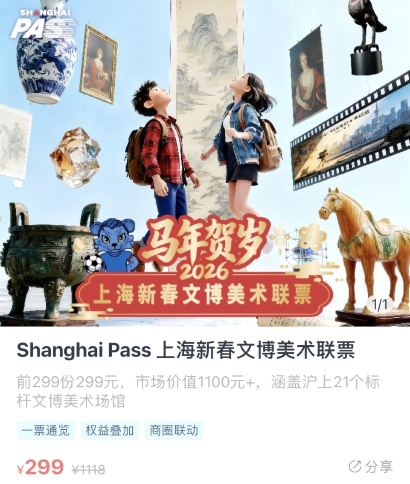 如果你更爱逛博物馆、美术馆,今年春节推出的“新春文博联票”可能更对胃口,298元,可以畅玩上海博物馆、浦东美术馆、上海科技馆等20多个文旅场馆。