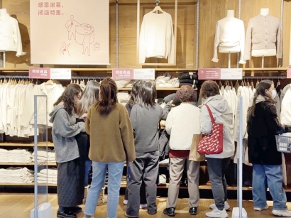 日前,MUJI无印良品正式官宣:上海淮海755世界旗舰店将于3月31日正式闭店。这座2015年开业、陪伴上海市民十余载的淮海路生活美学地标进入闭店倒计时。门店同步开启的闭店特惠活动也让这里瞬间成为沪上热门打卡地。记者实地探访发现,闻讯而来的市民络绎不绝,店内各处人头攒动。特别是收纳和餐具、水具因为闭店特惠折扣力度较大,还能叠加品牌国际妇女节特别礼遇满减,成为市民们的囤货热门。