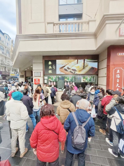 队伍看着壮观,实则走得很快。不同于有些老字号动辄数小时的等待,沈大成外卖窗口的分流,让排队变成了一件超有效率的事。