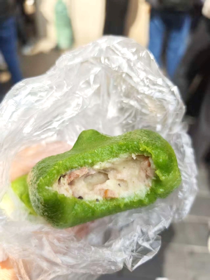 记者也买了两只尝了尝。入口咸香带奶香,培根的烟熏味很点睛,土豆泥绵软细腻。馅料本身出色,和青团皮子也意外地搭。有网友锐评:“这个是奶油培根意面味儿,吃着太好玩了。”