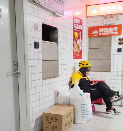 在宝誉美食广场二楼走廊尽头的一众外卖店之中,记者看到了曼玲粥店的红色招牌。相较于大门和楼梯的区域,聚集着多家外卖店的二楼厨房区域视觉上要干净明亮许多,一家家外卖品牌厨房分列在走廊两侧。曼玲粥店出餐口前的凳子上,坐着一位身穿美团制服的外卖小哥。听闻记者询问是否可以堂食后,这位小哥小声嘀咕道:“没有(桌子凳子)的。”