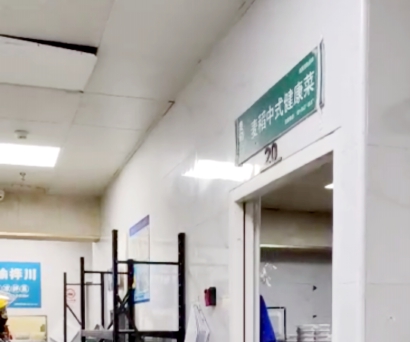 在爬上30多阶蓝黑色的简易楼梯后,记者看到了占据走廊一侧房间的麦稻中式健康菜。一块简易的绿色招牌,一排外卖餐架,一间大厨房构成了这家店的全部。