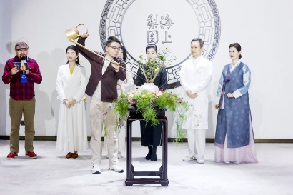 五位嘉宾代表手持来自五方的水土,依次登台,缓缓注入中央茶艺装置,宣告着海上梨园“湖心亭海上茶席”正式开启。