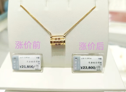 一款周大福的足金钻石项链,柜台上标的一口价还是36600元,新换上的价签就显示为40600元了。这一涨幅约在10%左右,并没有达到此前传闻的15%-30%,但毕竟“正在换价签”了。感到时间紧迫的张女士最终还是出手,将心仪的金饰买了下来。