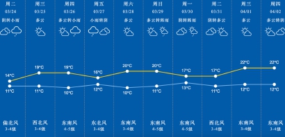 雨水或也将拖低气温。本周三、四最高气温升至19℃等,周五跌回16℃;周六周日升至20℃,下周初跌回17℃。